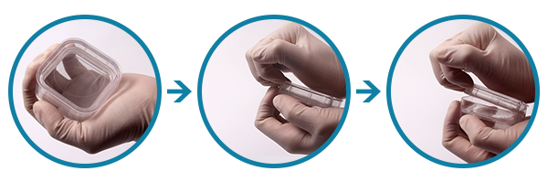 步骤 1: 一只手抓住盒子边缘 步骤 2: 另一只手抠住盖子边缘R角。 步骤 3: 打开盖子后将产品放入或取出。